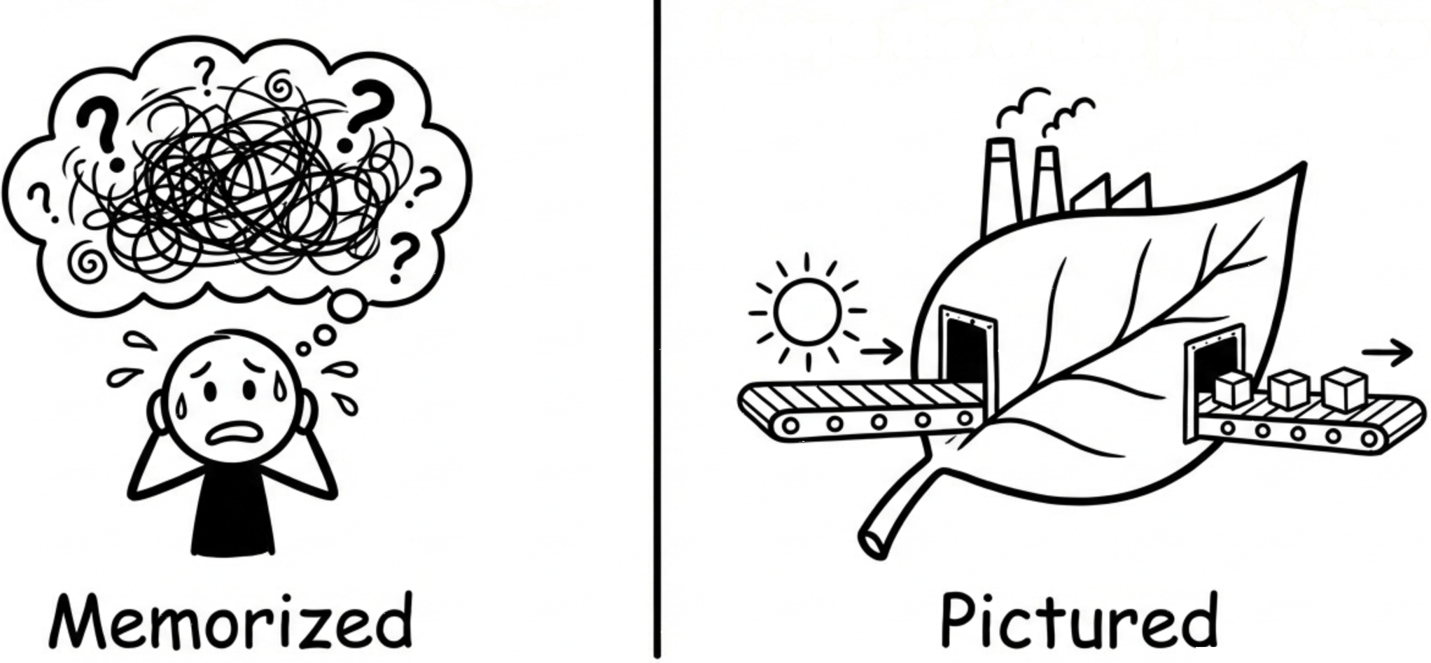 A leaf is a tiny factory. Sunlight comes in, sugar goes out, and that sugar keeps the whole plant alive.One line is memorized. The other line is pictured.